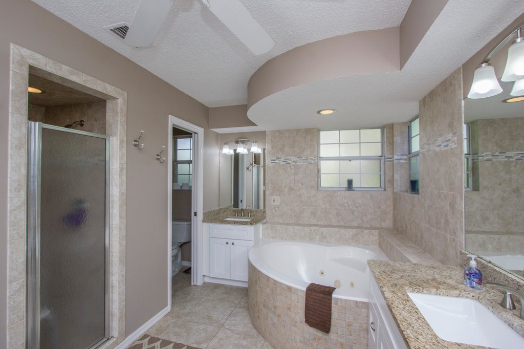 On to the master suite which is another amazing space in this home. Should we begin with the large walk-closet with shelving or the grand master bath which offers a garden tub, separate tiled shower and granite counter sink? Either way, I would say this mater suite is a treasure.
