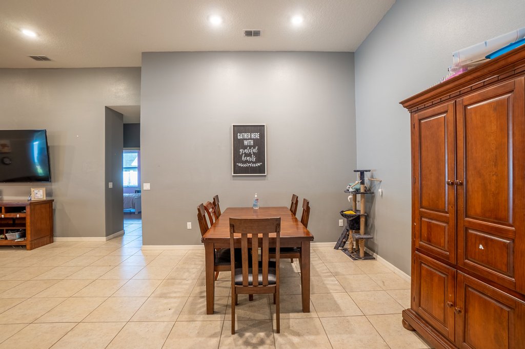 Upon entry is your Den/Office with double door entry. Huge Living Room & Dining Room combo with over 12 ft. volume ceilings with recessed lighting.