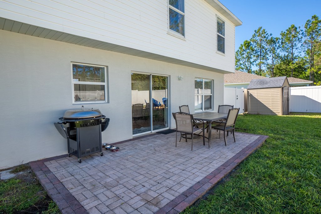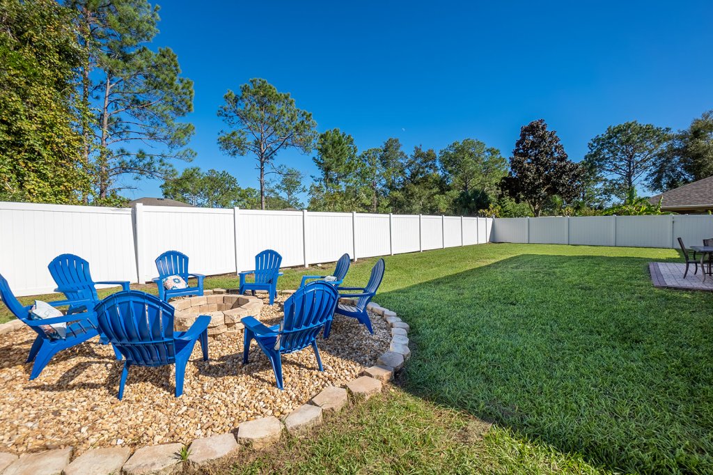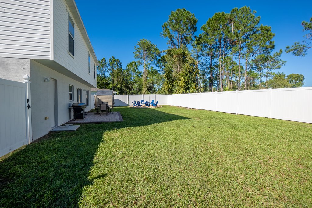 The living room slider exits to the patio and large backyard featuring a cozy fire pit area and small garden shed.
