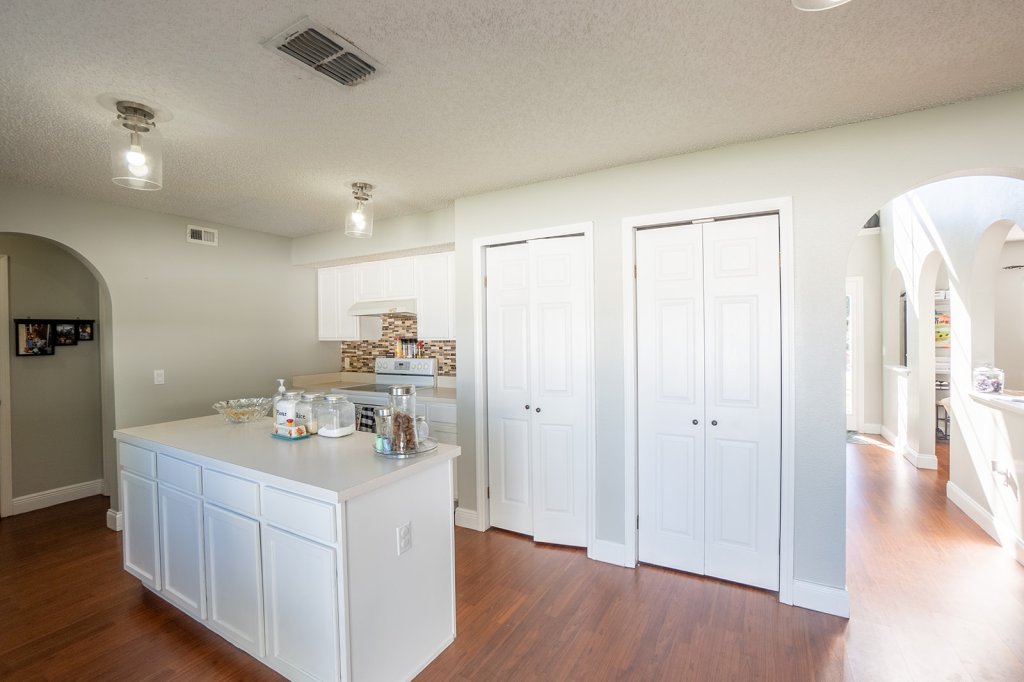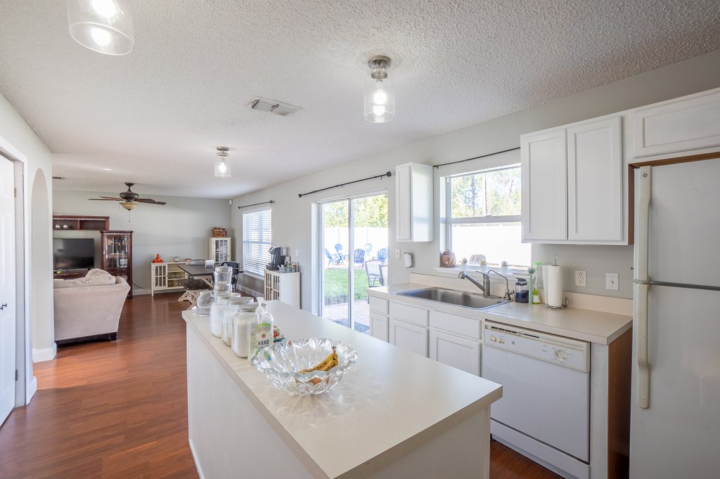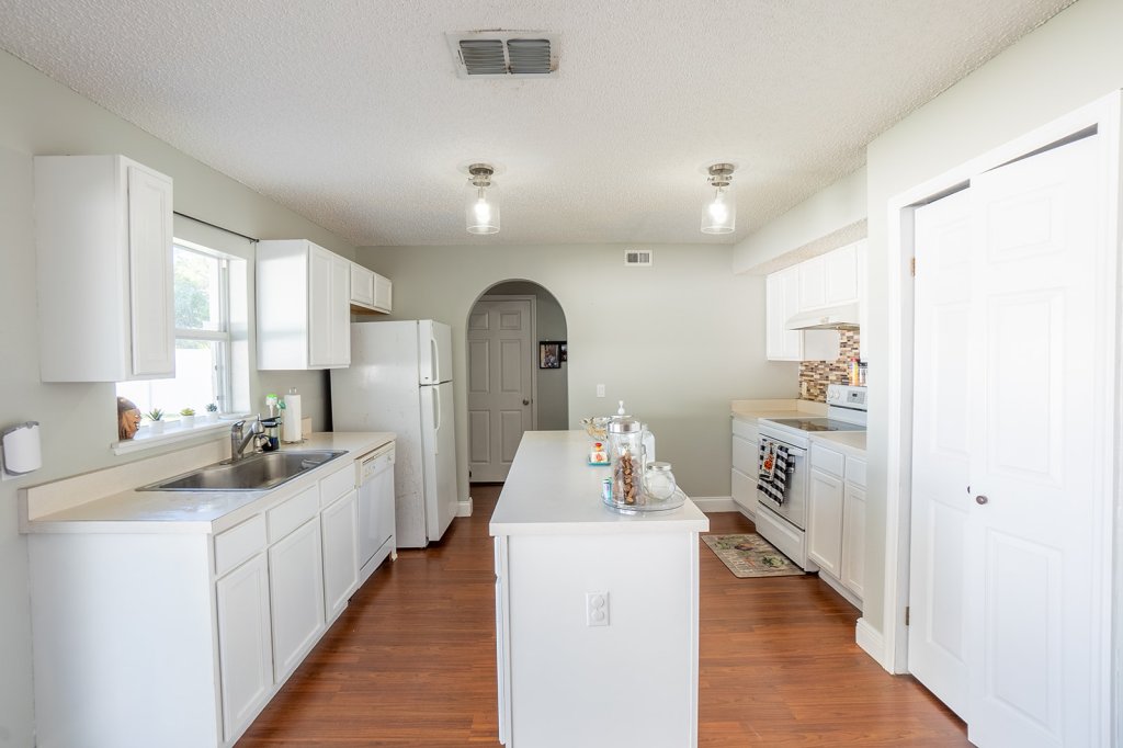The white cabinet kitchen overlooks the quiet backyard that focuses on a fully fenced yard, perfect for your morning coffee or evening barbecue. (More on that later).
