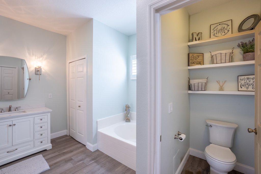 The master suite is HUGE offering a large bedroom, dual sinks, soaking tub, walk-in closet, separate shower and linen closet. All Upgraded and Brand New as well.