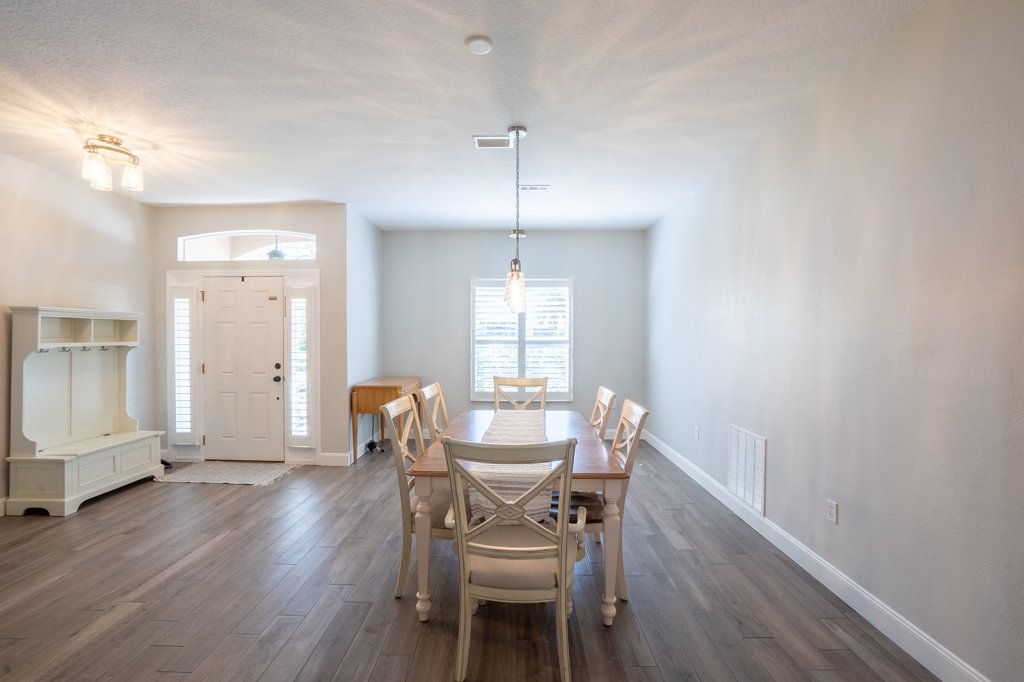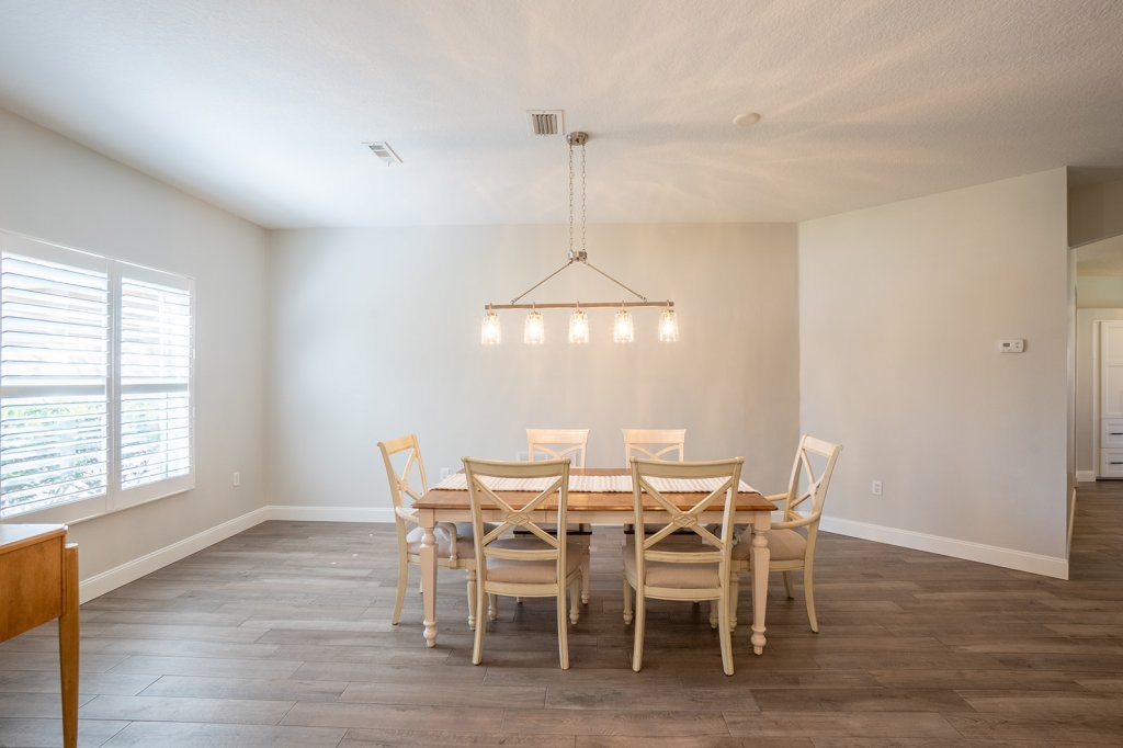 Once inside you are greeted with natural light and high ceilings. White plantation shutters and gorgeous tile flooring. Clean lines and neutral color tones make this home light and bright. The formal dining room and formal living Room are the first two rooms of the layout. You could easily use your imagination and convert these rooms into playrooms, offices or whatever your lifestyle preferences are. Updated light fixtures and no popcorn ceiling here!