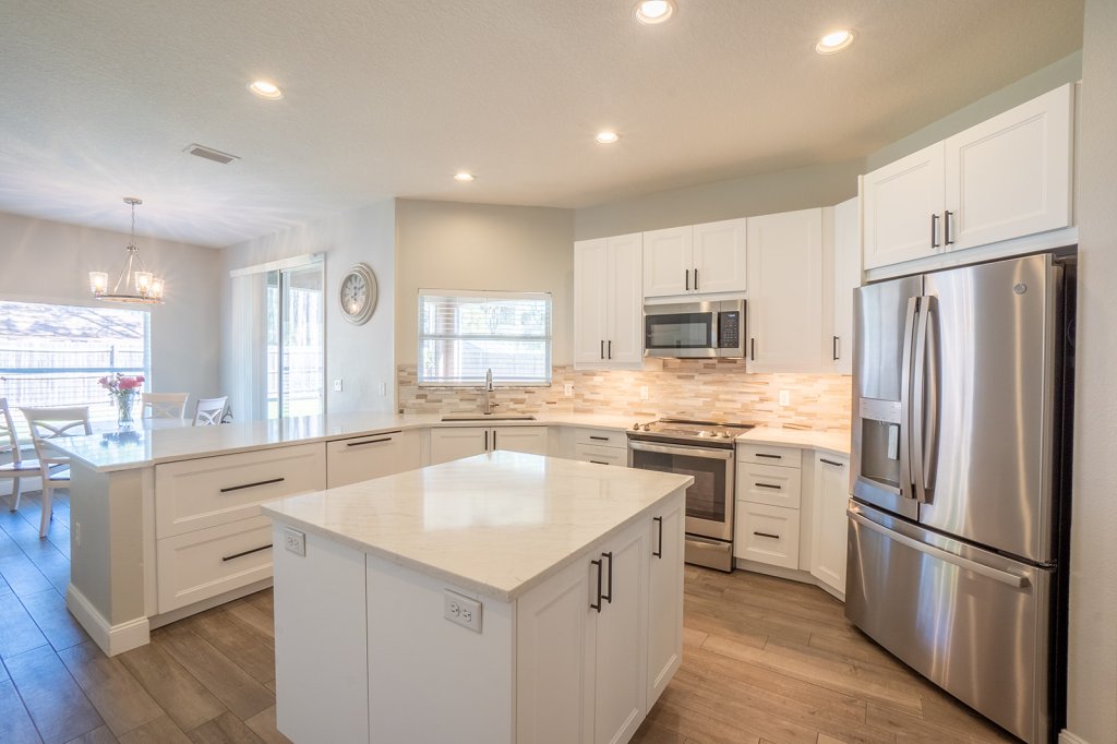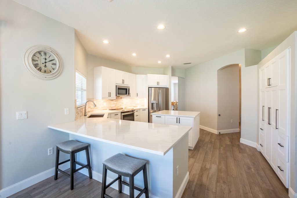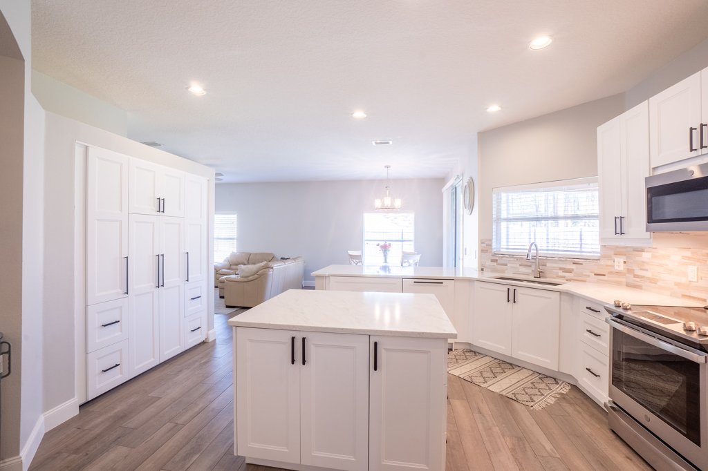 One of the best and impressive parts of the house is the kitchen! The eat in kitchen with breakfast bar has been completely remodeled from top to bottom. There are even lights in the silverware drawer and hidden drawers to optimize space. Pompeii Quartz Countertops, Sparkling Clean Tile Backsplash, kitchen island with electrical outlets. The white cabinets are all brand new and feature pull out drawers, large handles and plenty of storage. The pantry was remodeled to be the storage space of your dreams. This kitchen is perfect for entertaining but is also functional for everyday use.