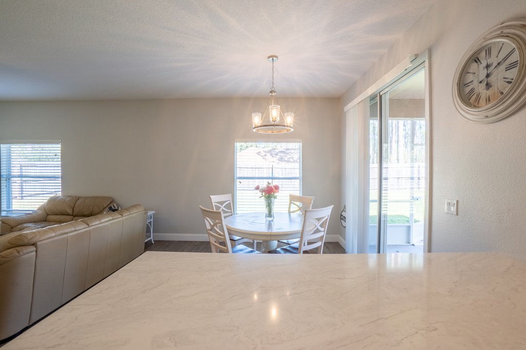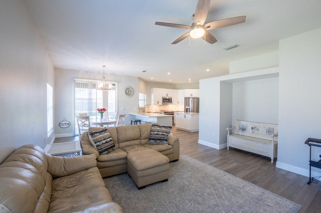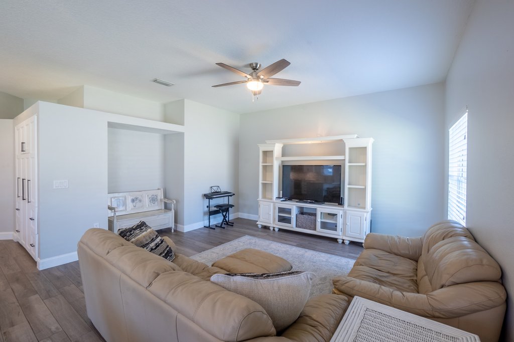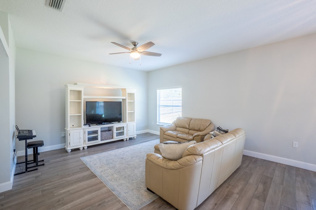 Additional Family Room for entertaining in view of the kitchen which also leads to the sliding glass door to the covered porch.
