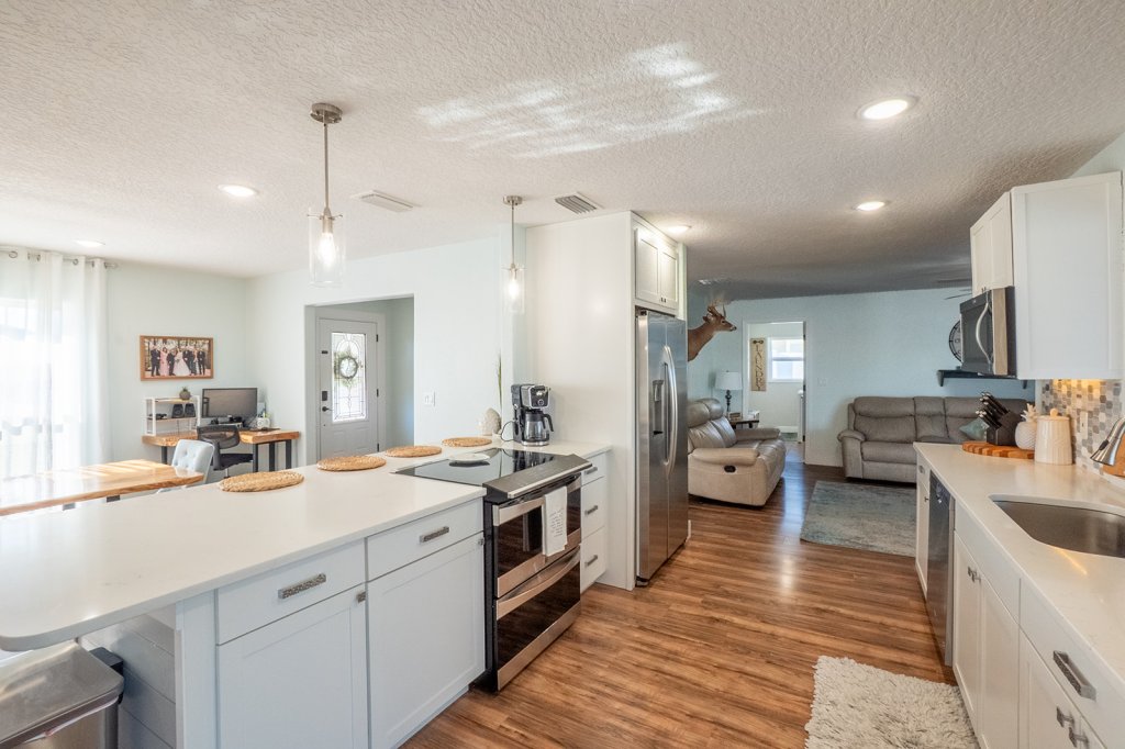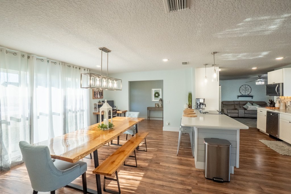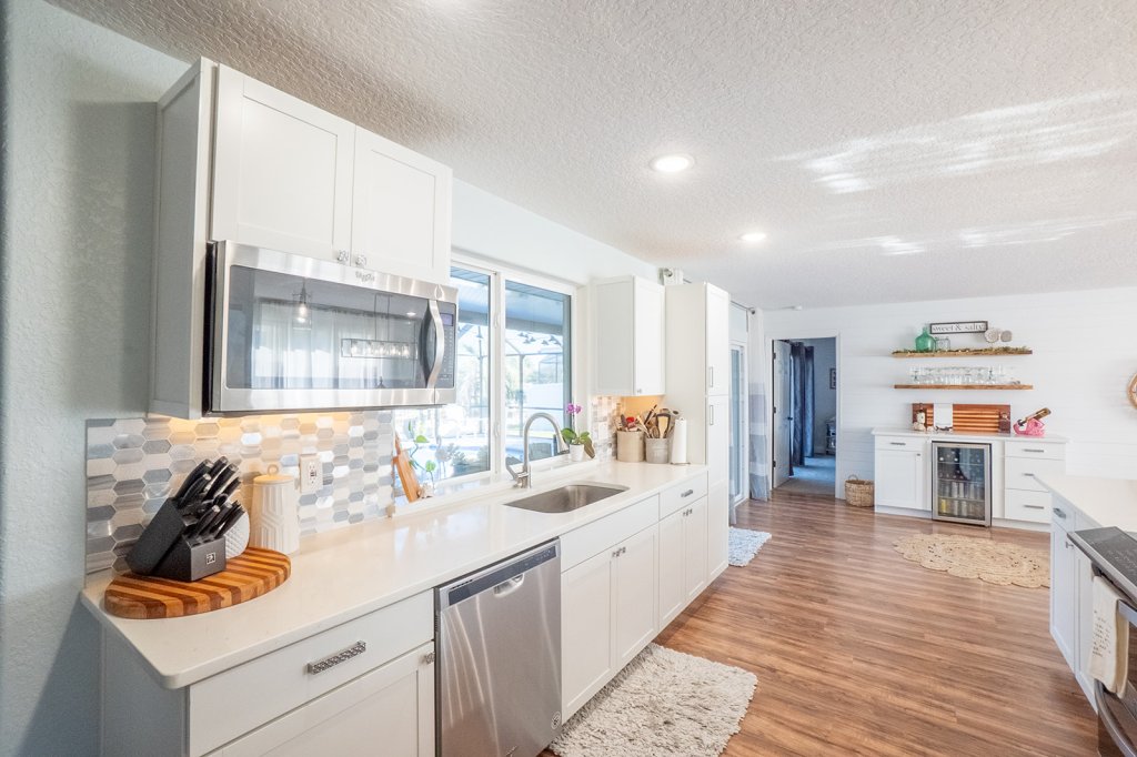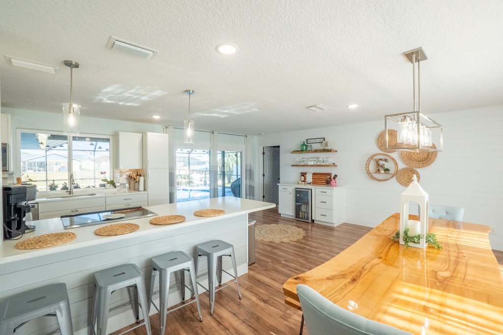This exquisite home has been beautifully updated to offer modern elegance and functionality. Featuring an open split floor plan, it provides the ideal layout for both entertaining and everyday living. The stylish kitchen is a chef’s delight, boasting quartz countertops, crisp white cabinetry, and a wine bar—perfect for hosting family and friends.